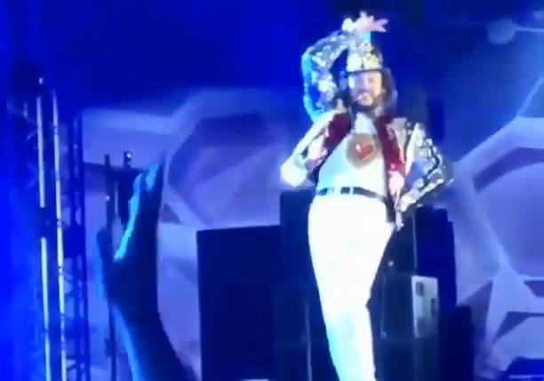 Для исполнения своего хита «Цвет настроения - синий» Филипп Кирокров надел белые обтягивающие брючки, короткий блестящий пиджачок и такой же блестящий головной убор, напоминающий котелок и цилиндр одновременно.
